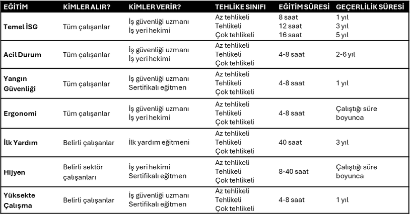 1.Tüm firmalardaki her çalışanın alması zorunlu tutulmuş eğitimler: